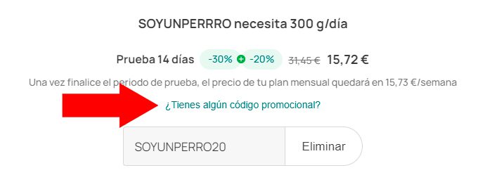 Simplemente debemos rellenar los datos que nos piden sobre nuestro perro para que calculen la ración diaria recomendada de comida natural Dogfy Diet, y justo antes de finalizar el pedido, haremos click en el botón «¿Tienes algún código promocional?» y ahí introduciremos el texto SOYUNPERRO20 y le haremos click en el botón «aplicar».
